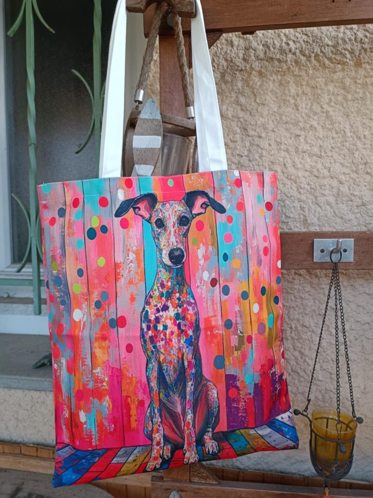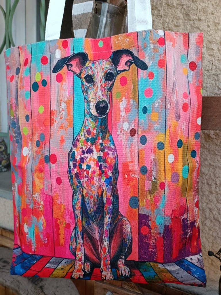 Tote bag galgo, actuellement tous vendus, une commande est en cours.