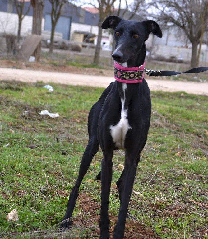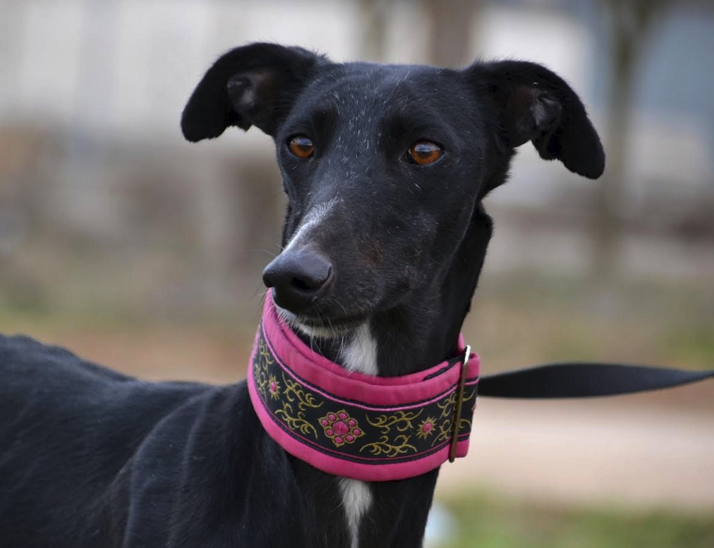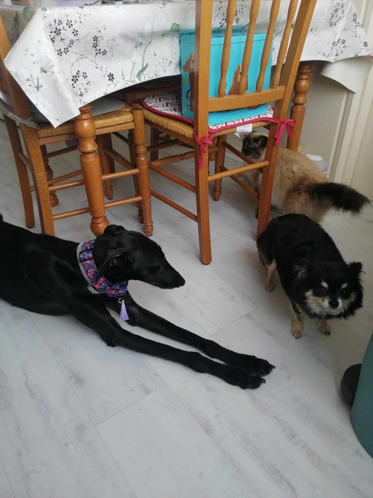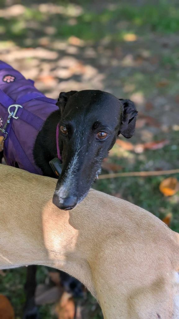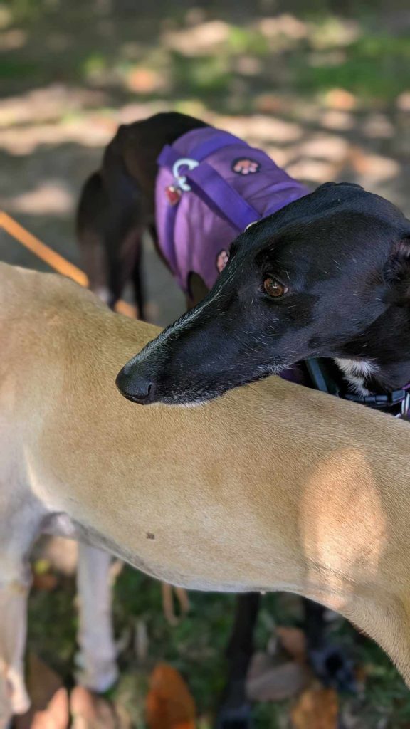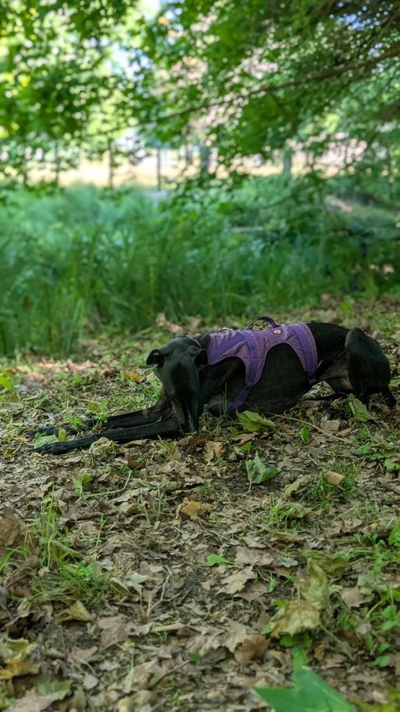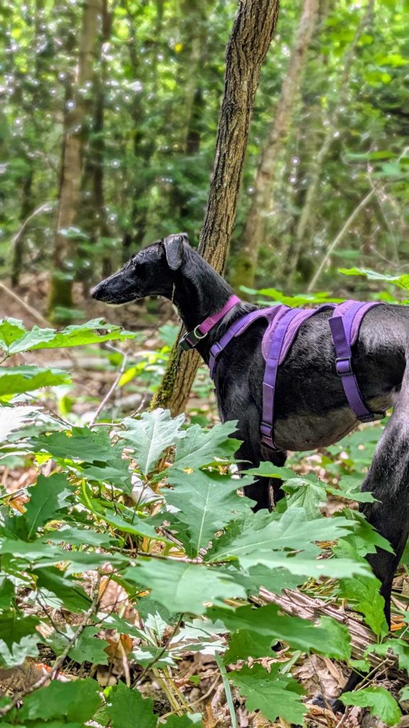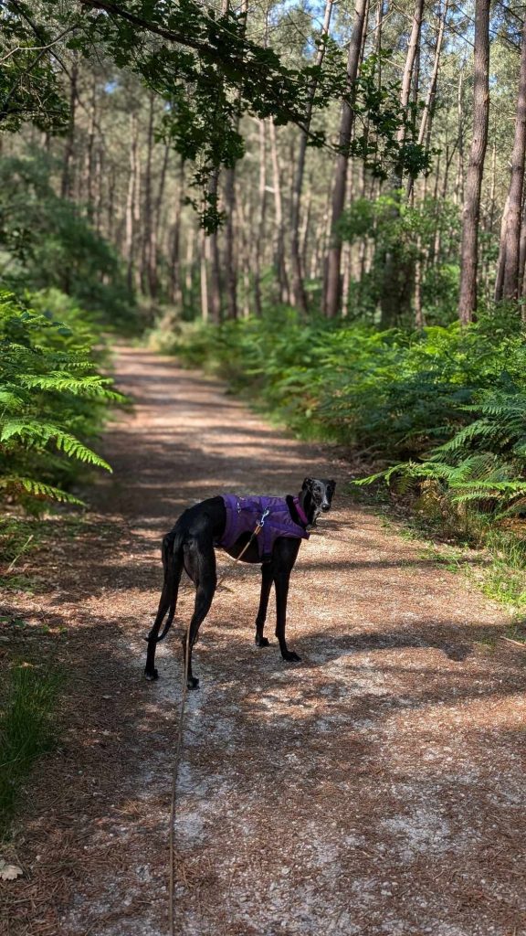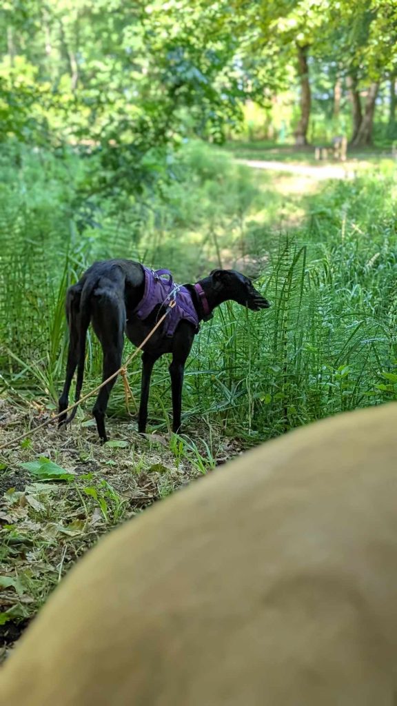 India est très contente de faire une balade dans un nouveau bois et avec une copine galga.